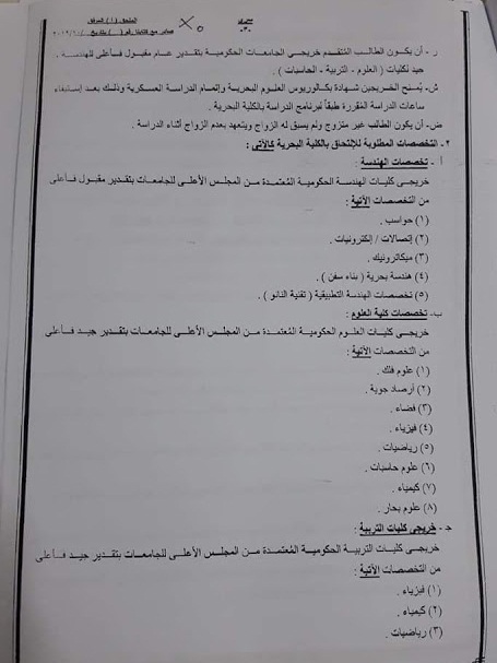 التخصصات المطلوبة للاتحاق بالكلية البحرية كالاتى خريجى كلية الهندسة … تخصصحواسب – اتصالات / الكترونيات – ميكاترونيك – هندسة بحرية ” بناء سفن ” – هندسة تطبيقية ” تقنية النانو”خريجى كلية العلوم علوم فلك – ارصاد جوية – فضاء – فيزياء – رياضيات – علوم حاسبات – كيمياء – علوم بحارحريجى كلية التربيةفيزياء – كيمياء – رياضياتتفاصيل التقديم وكافة البيانات والمعلومات المراد معرفتها عن التقديم وغيره فى الاعلان بالاسفل المكون من 4 صفحات
